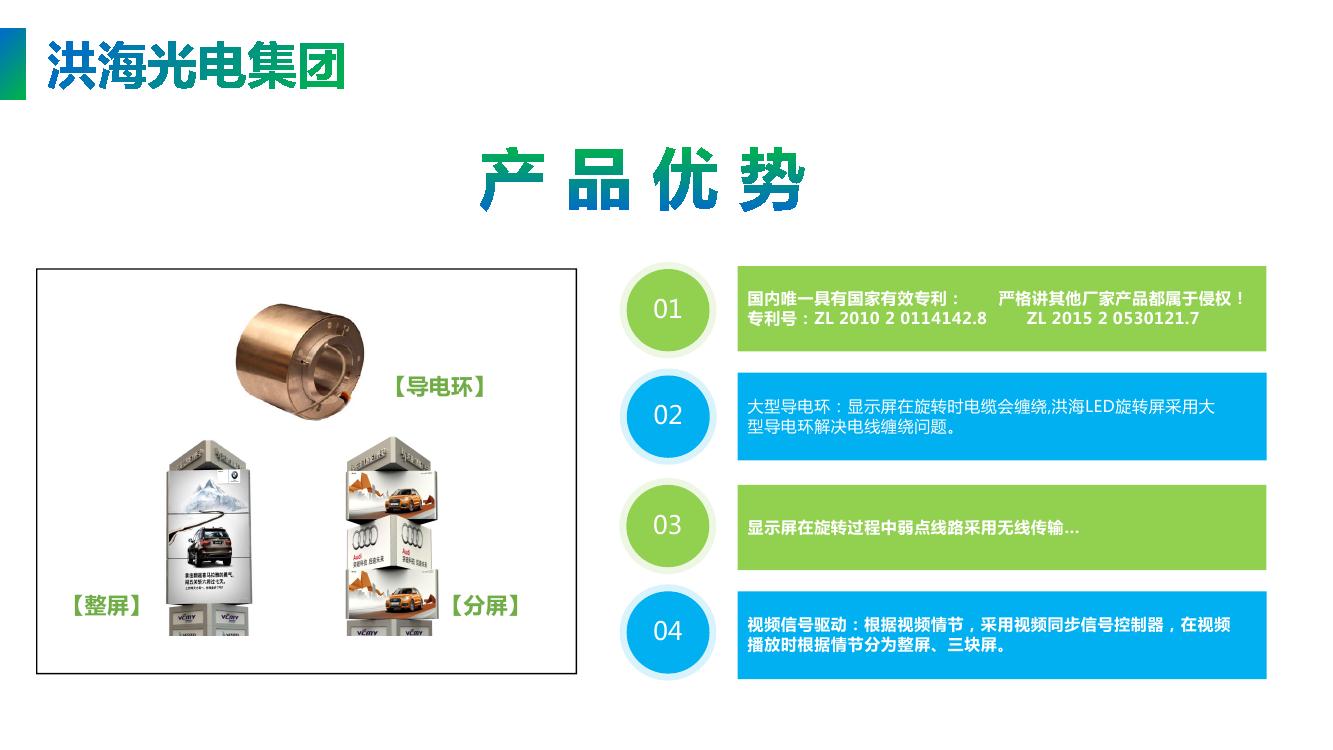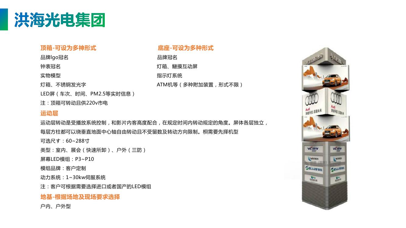 具體來說是:LED旋轉魔方屏是由三角形或四方形LED顯示屏箱體組合,在旋轉支撐、不繞線導電刷、轉動花樣軟件編程等多個系統配合下,使三個三角形或四方形LED顯示屏按照電腦編制的程序---不同時間花樣轉動---定格在一個平面,展示三個視頻畫面。相比傳統顯示屏更具有動感和視覺沖擊力,新穎的廣告形式,大大提高了顯示屏的功能檔次和外觀裝飾效果,同時具有藝術氣質的高科技產品,瞬間吸引您的眼球,提升廣告創意,帶來更大的商業價值,成為美化城市的城市地標。