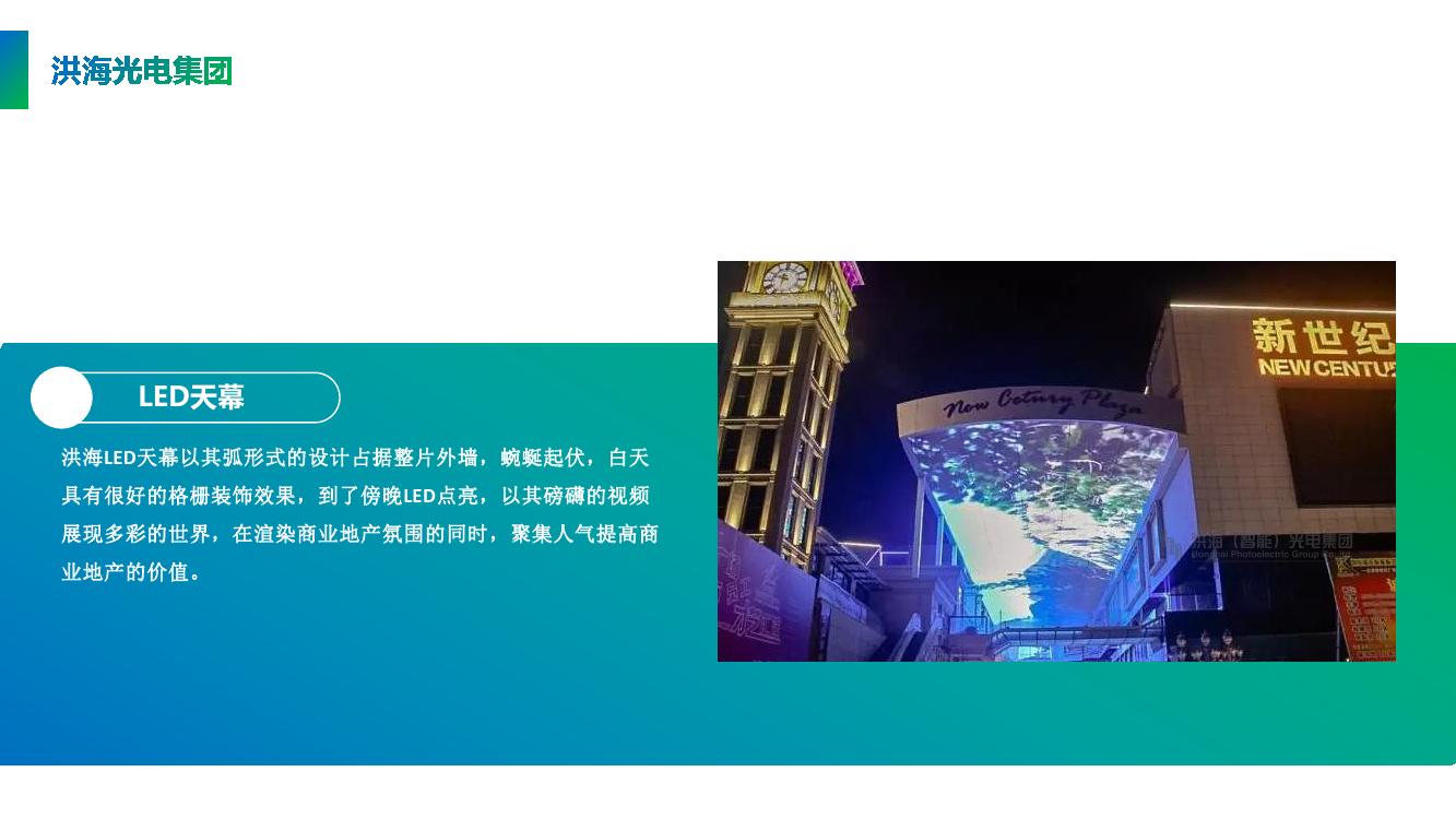 洪海LED天幕(彩色矩陣天幕)以其弧形式的設(shè)計占據(jù)整片外墻,蜿蜒起伏,白天具有很好的格柵裝飾效果,到了傍晚LED點亮,以其磅礴的視頻展現(xiàn)多彩的世界,在渲染商業(yè)地產(chǎn)氛圍的同時,聚集人氣提高商業(yè)地產(chǎn)的價值。